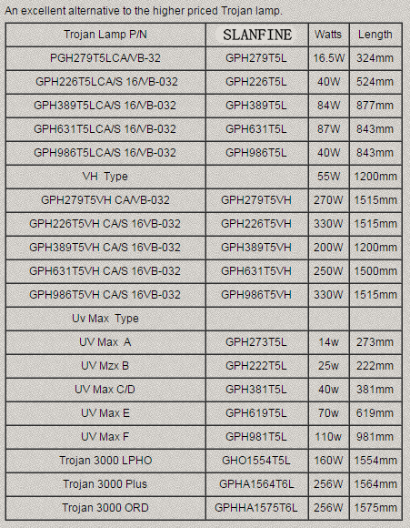 direct replacement ultraviolet lamps, quartz sleeves and other spare parts that meet or exceed Original Equipment Manufacturers’ specifications. Purchasing replacements from us provides you with quality products, in stock inventory, knowledgeable customer service, and an industry leading warranty. See below for a list of replacement products for Trojan Technologies